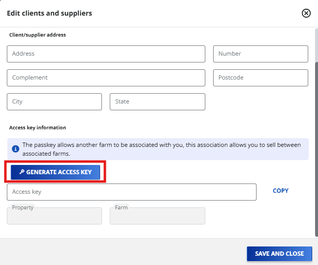 Go to Farm > Settings > Records > Basics > Clients and Suppliers > Search for supplier > Edit register > Click on “Generate access key” > Save > Icon changes to a key.