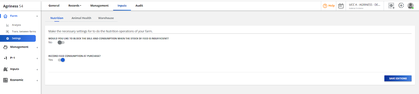 Just as nutrition settings are important, if the farm wants to control feed purchase, consumption, and inventory with S4 support. To facilitate farm operations, we recommend enabling record feed consumption at purchase setting.