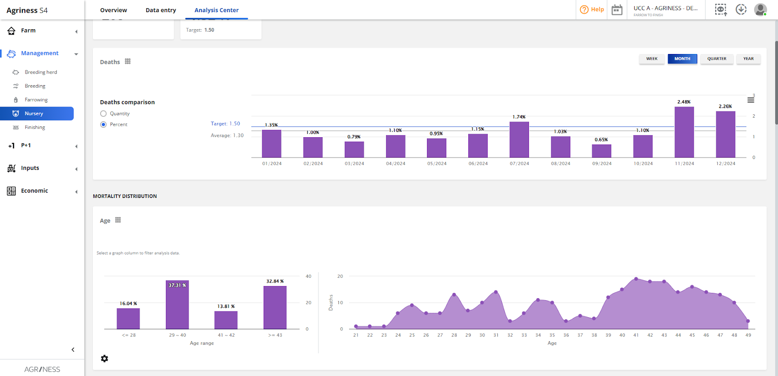 It indicates the percentage of animals that died during the phase. Analyze mortality as a percentage (total deaths over total animals) and, crucially, by age or days in phase. This detailed evaluation helps identify mortality peaks at specific ages, which may be related to health challenges, post-weaning stress, management failures, or nutritional issues in critical phases. Late-batch mortality is more harmful, as the animal has already consumed most of the feed, negatively impacting FCR and cost.