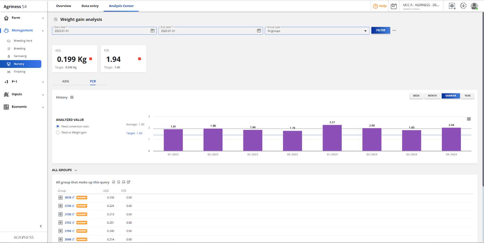 In S4, it can be analyzed in: Analysis Center > Weight gain analysis > FCR