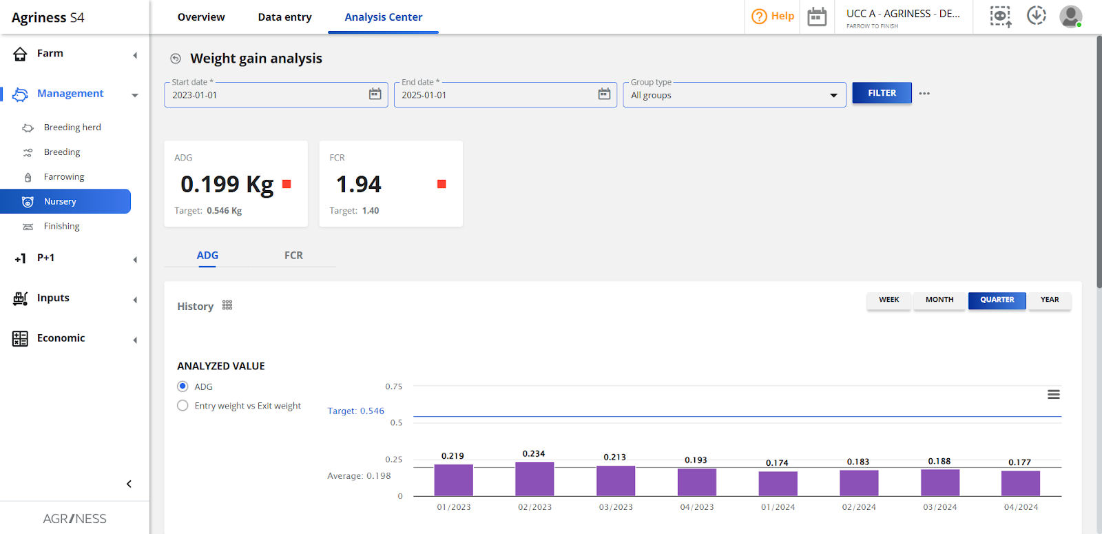 It measures the average weight an animal gains per day within a given period. An adequate ADG indicates good health, nutrition, and welfare. Compare ADG between different batches, genetics, and diets to identify the best management practices.