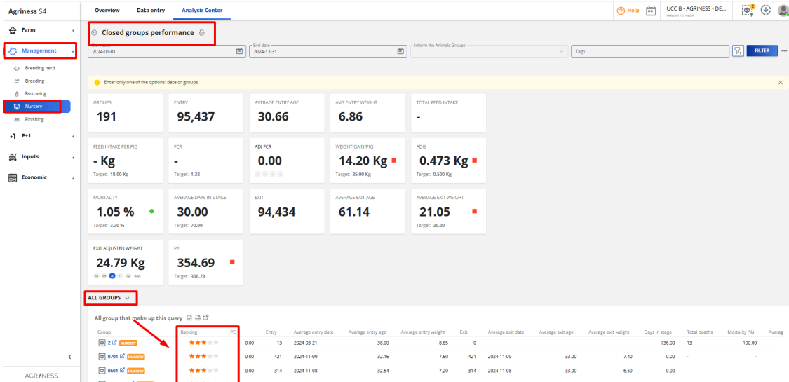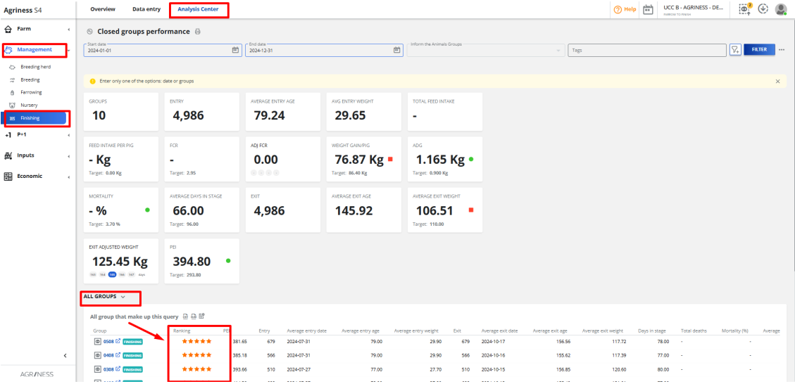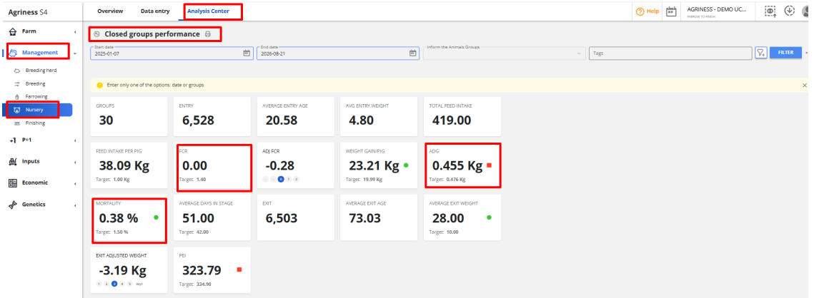 Management > Nursery or Finishing > Analysis Center > Closed groups performance