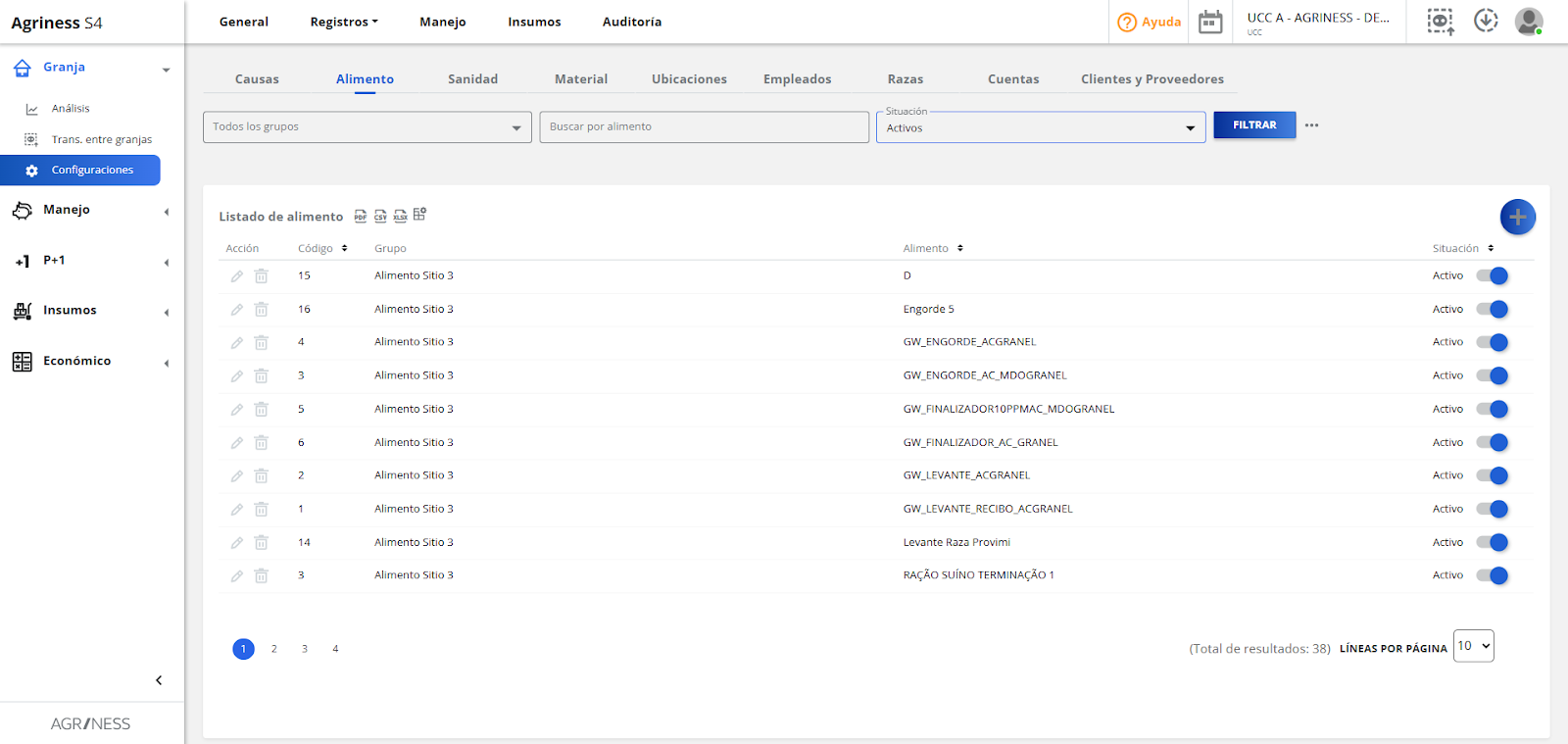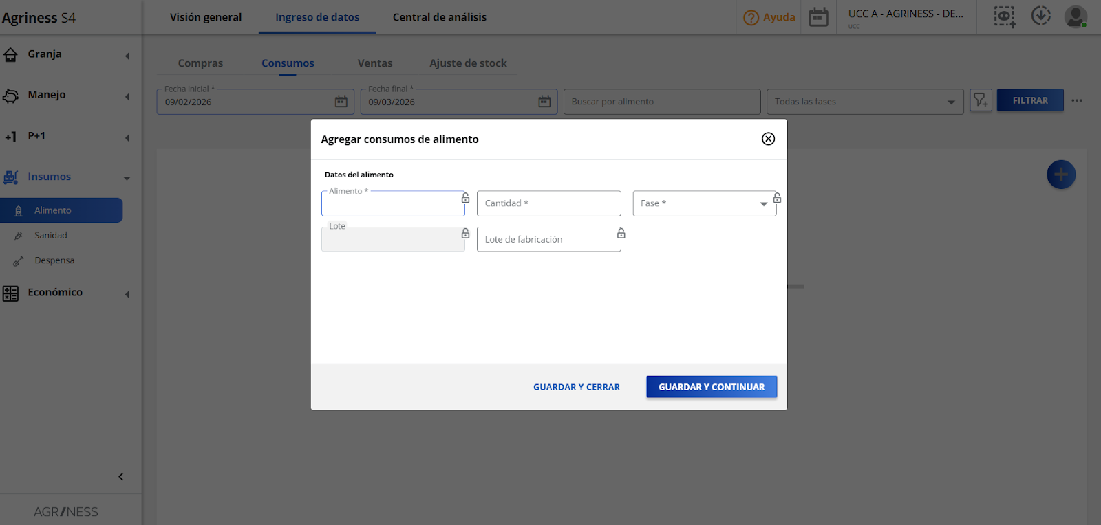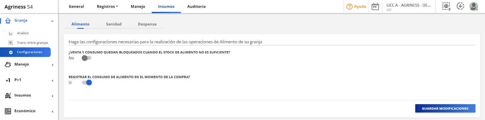 Así como los ajustes de nutrición son importantes, si la granja desea controlar la compra, el consumo y el inventario de alimento con el apoyo de S4. Para facilitar las operaciones de la granja, recomendamos habilitar el ajuste de registrar el consumo de alimento en la compra.