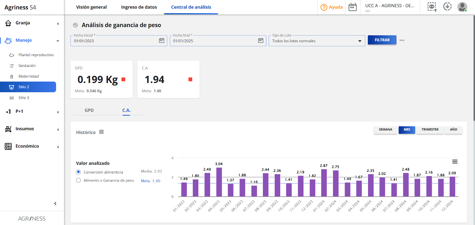 Cuántos kilogramos de alimento necesitó consumir el animal para ganar 1 kg de peso. Es el principal indicador de eficiencia. Cuanto menor sea la CA, más eficiente será su producción. Una CA alta puede indicar desperdicio de alimento, problemas de salud o una dieta inadecuada.