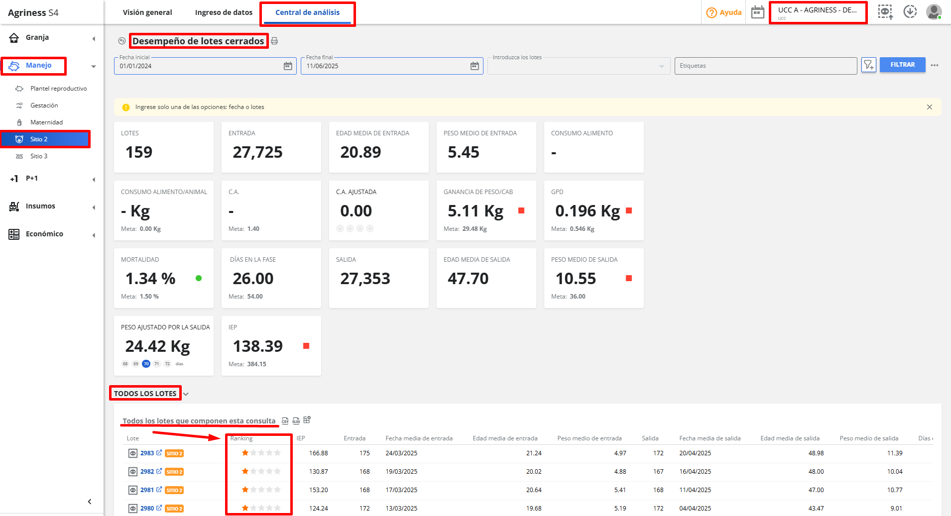 El ranking clasifica los lotes comparando el IEP real con la meta de IEP de la granja. La clasificación se aplica a un lote específico y la meta de IEP se define previamente según las condiciones de la granja.