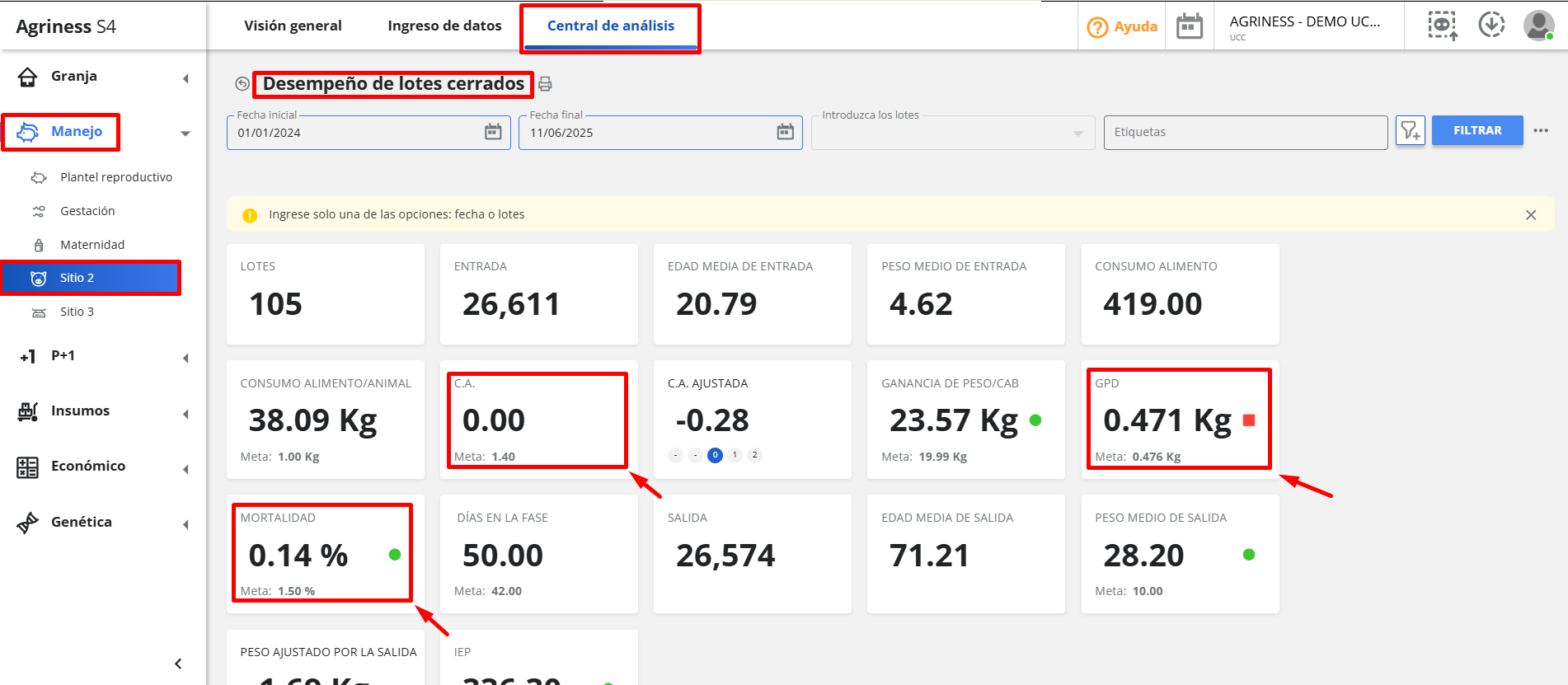 Manejo > Sitio 2 o Sitio 3 > Central de Análisis > Desempeño de lotes cerrados