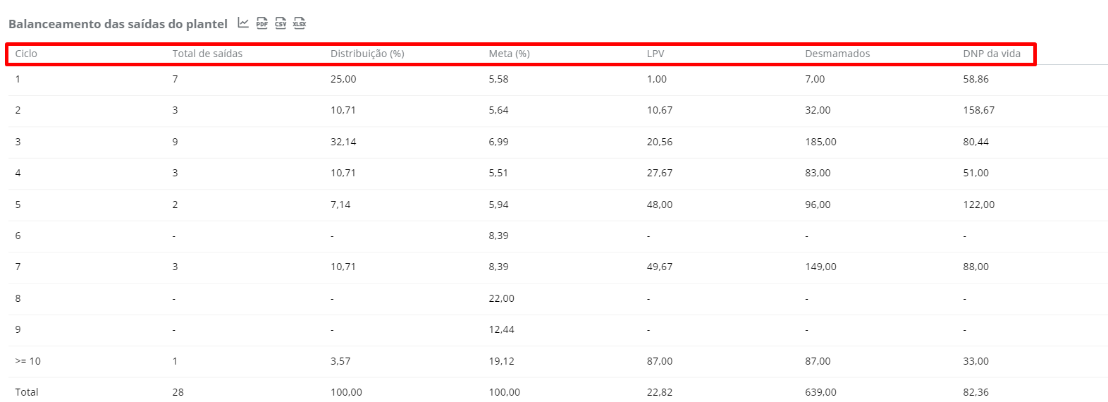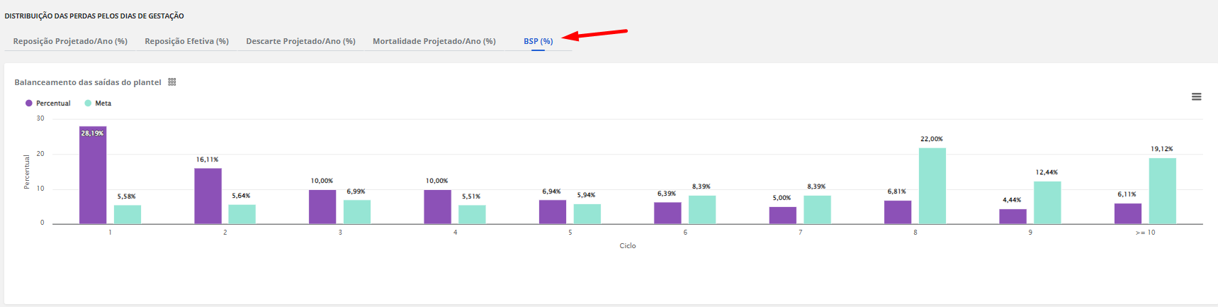 A análise BSP, significa Balanceamento das saídas do plantel, ou seja, é o resultado do percentual de matrizes removidas (por morte ou descarte) por ciclo em um determinado período.