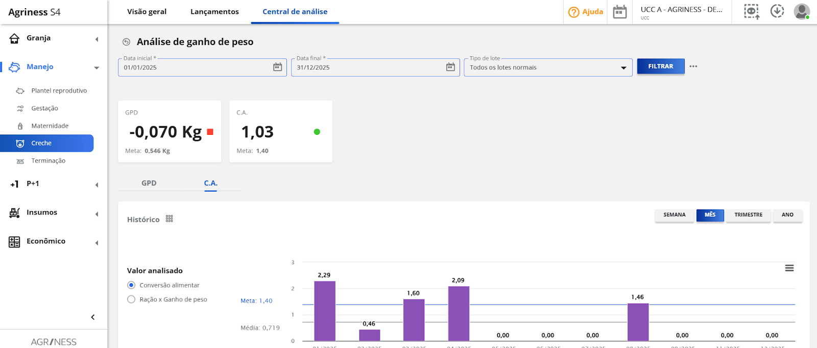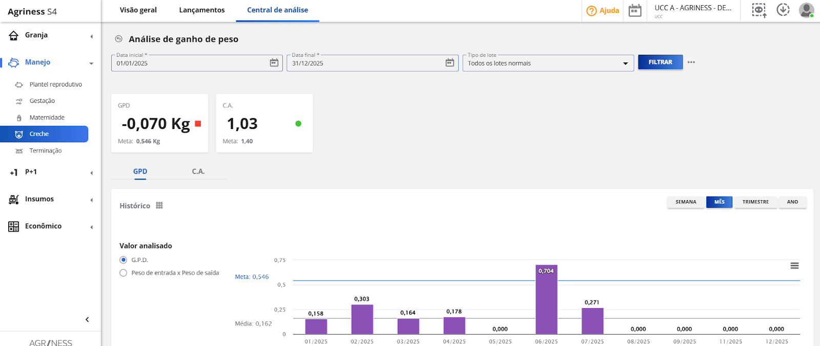 No S4, pode ser analisado em: Central de Análise > Análise de ganho de peso > C.A