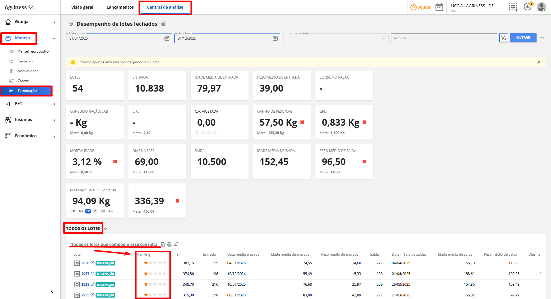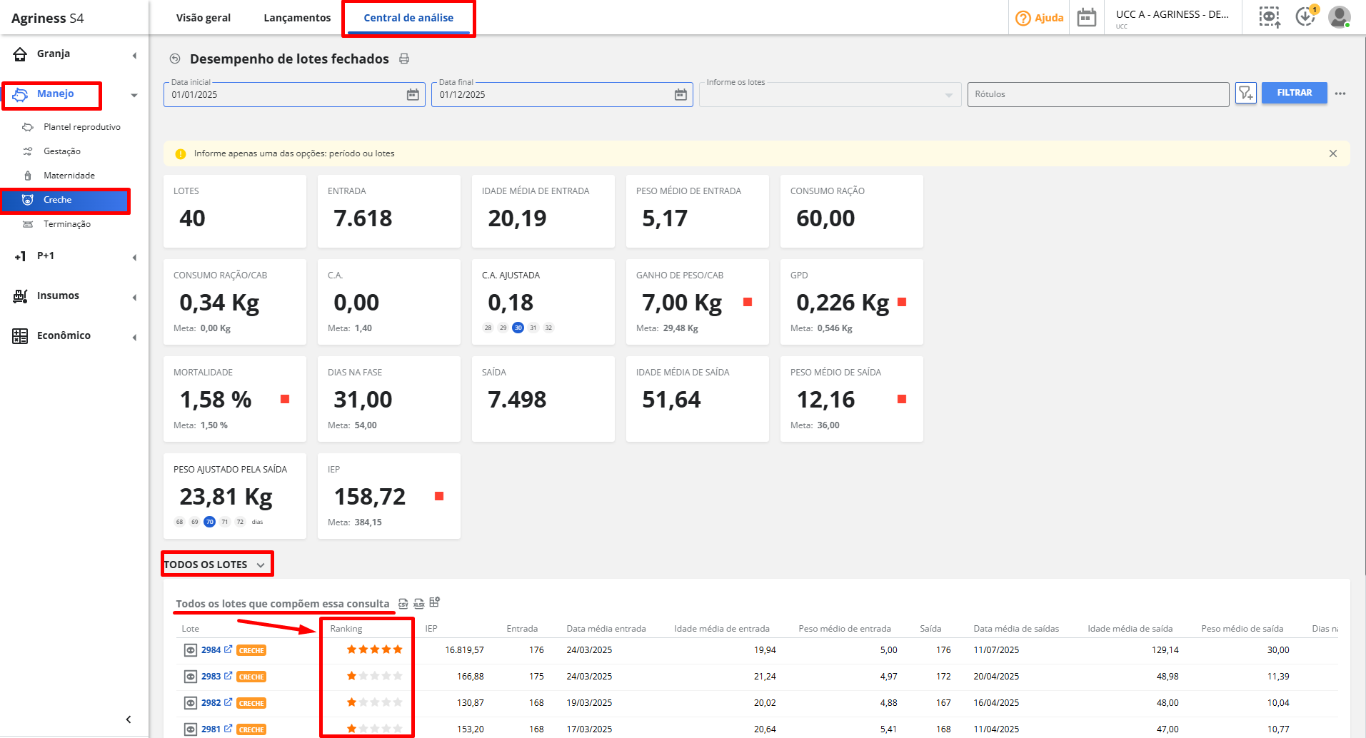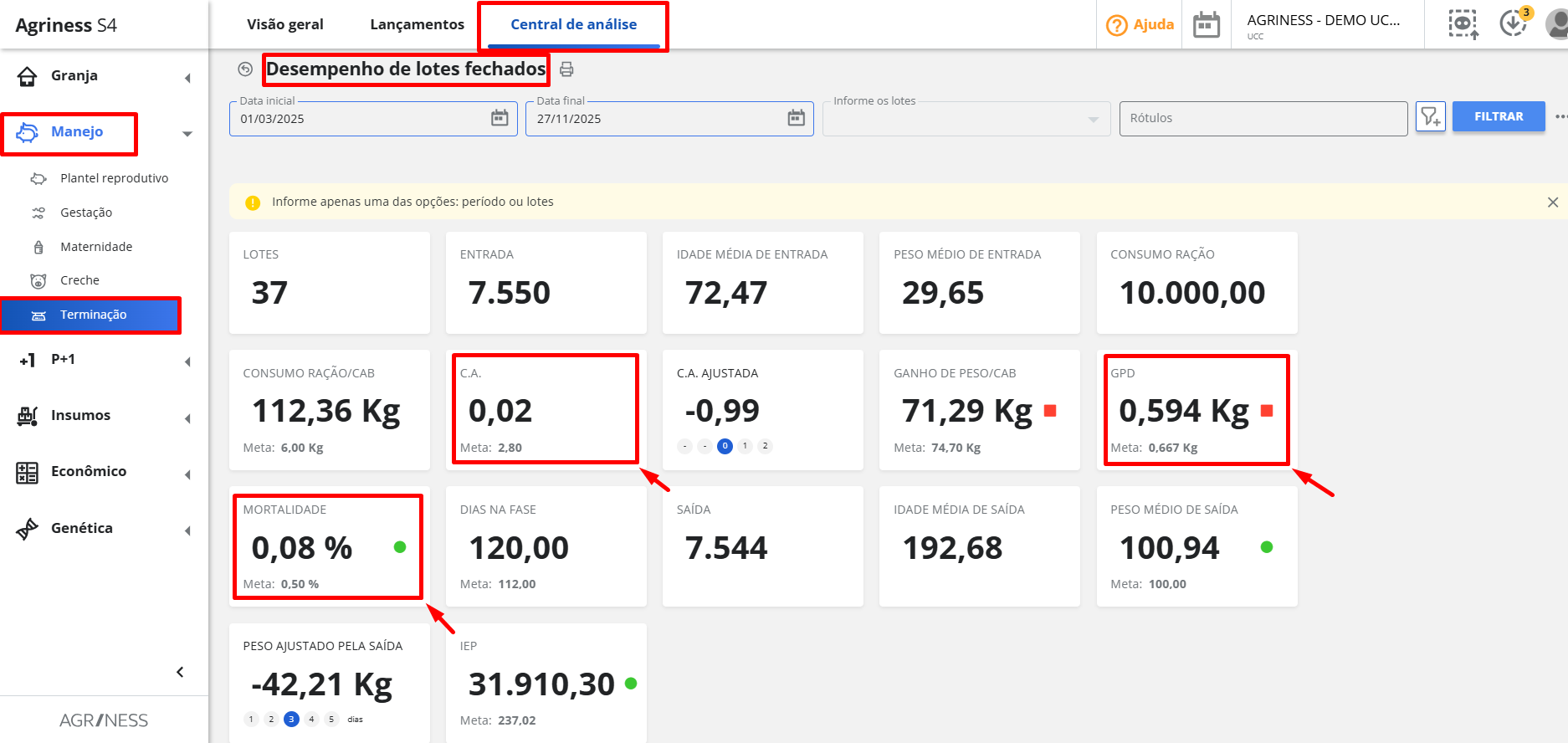 Manejo > Creche ou Terminação > Central de análise > Desempenho de lotes fechados